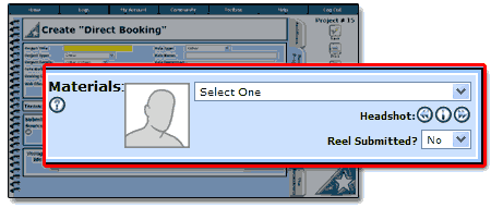 The images that appear in the Materials area are bridged over from PerfomerTrack's Headshot Library. Only the Headshots with their Headshot Status set to Active in your Headshot Library section will be shown in the drop down menu. To access the Headshot Library go to Top Toolbar > Logs > Essentials Log > Headshot Library