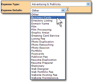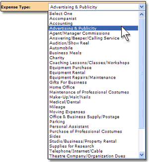 No matter what you spend your money on, PerformerTrack's Expense Type drop down menu has over 30 pre-defined categories to make entering your business-related expenses a snap!
