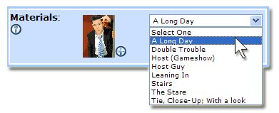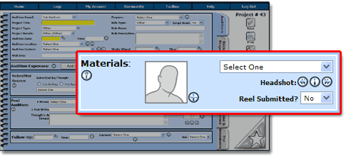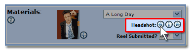 The images that appear in the Materials area are bridged over from PerfomerTrack's Headshot Library. Only the Headshots with their Headshot Status set to Active in your Headshot Library section will be shown in the drop down menu. To access the Headshot Library go to Top Toolbar > Logs > Essentials Log > Headshot Library
