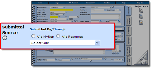 When you toggle "Via Resource" a drop down menu will appear with the names of your Active Submission Resources. Select the Submission Resource that got you into the Audition.