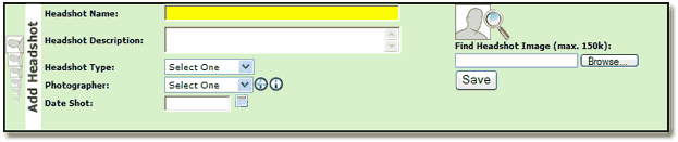 To add a new image to your Headshot Library is easy! Just enter the appropriate information into the 'Add Headshot' Area located at the top of the Headshot Library Overview Screen.