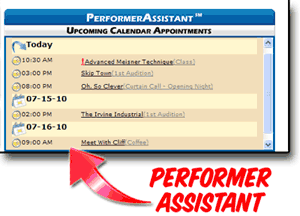 PerformerAssistant gives you a quick view of Upcoming Calendar Appointments and will let you know about Important Messages & Alerts from PerformerTrack, such as scheduled server maintenance, recent upgrades and other various application enhancements.